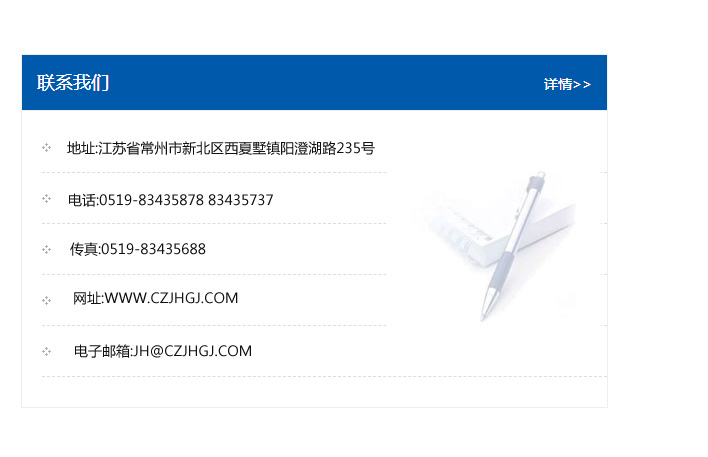地址:常州市新北區友邦商務大廈1幢16、17層  電話:0519-85101652  傳真:0519-85112595  郵編:213022  網址:www_cz-jiayue_cn.bzpxw.com  郵箱:xiajifengaa@163.com
